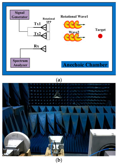 In this section, we present some experiments to verify our proposed scheme at the proof-of-concept level. RDE experiments, referred to as single-in–single-out (SISO) and multiple-in–single-out (MISO) were carried out. The prototype of the transmitting antenna platform, which can transmit the rotational OAM beams, is shown in Figure 5. The OAM beams were generated by putting a spiral phase plate (SPP) ahead of a horn antenna with 20 dB gain [22]. In our experiments, two SPPs were used, i.e., mode +1 and mode −1. Before the experiments, the radiation pattern of the transmitting antenna was measured to make sure that they could generate vortex EM waves of correct OAM modes. The electrical machinery was used to rotate the SPP mechanically, and the rotational speed could be adjusted by the controller. Without changing the polarization, the rotational OAM beams could be generated by the platform.