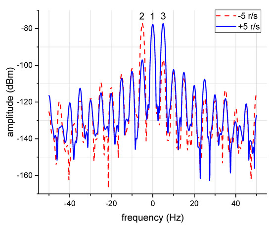 The frequency spectrums of the received signals for the rotation speed is −5 r/s (dash red), and the rotation speed is +5 r/s (solid blue).