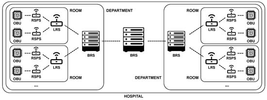 Figure 2 shows a potential deployment of this architecture in a hospital setting. In this example, there is one OBU and RSPS per patient, one LRS per room, one BRS per department, and another BRS for the full hospital.