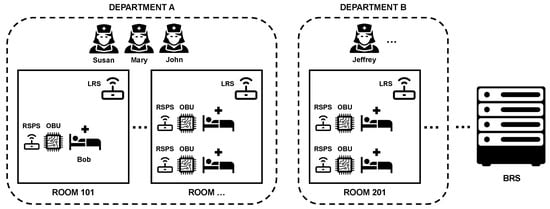 To map the architecture, a few assumptions about the hospital and its rooms are made. The hospital consists of multiple departments. On each department, multiple nurses are working. In each department, several hospital rooms are located, both single-person and multi-person rooms. In each room, there exists exactly one OBU and RSPS per bed, i.e., if accommodated, per patient. There is one LRS per room, independent of the amount of patients. Over the full hospital, only one BRS exists. For this implementation, such a simple set-up is considered. However, in a real-life set-up, there will typically be more than one BRS component in the system, e.g., an extra BRS per department, as indicated in Figure 2.