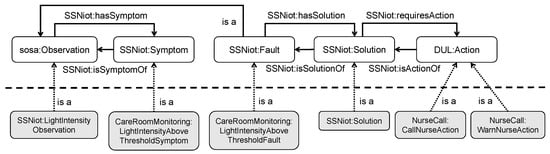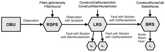 The approach of using medical symptoms, diagnoses, symptoms and faults allows complete separation of diagnosis registration and fault detection. For an observation to be a fault, the exact diagnosis of the patient located at the corresponding room is unimportant; only the medical symptom, e.g., sensitiveness to light or sound, needs to be known. Vice versa, a patient’s sensitiveness to light and sound, or any other medical symptom, does not need to be explicitly registered in the system; registering the diagnosis is sufficient. Because the diagnosis is already defined in the system according to medical domain knowledge, its corresponding medical symptoms are implicitly known.