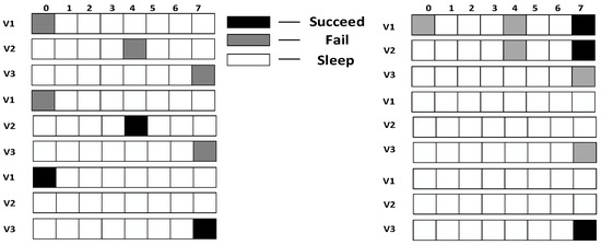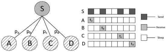 Research motivation is illustrated by describing how the sink node in Figure 2 transfers code to . The scheme in comparison is that proposed in Ref. [53]: parent node sends code at each of its son nodes’ wake slot. If son node fails to receive code, parent node will resend at the same slot in the next cycle. Therefore, the diffusion process of code to using traditional scheme is illustrated in Figure 3 (left). Every node only receives packet at its own slot. fails during the first and the second cycle and succeeds in the third cycle at its own slot, fails during the first cycle and succeed at its own slot in the second cycle, fails during the first and the second cycle and succeeds in the third cycle at its own slot, .