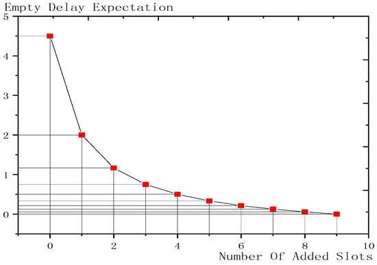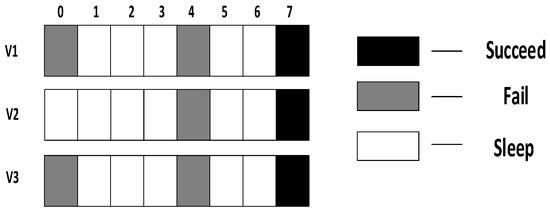 In the IFAS mode, since wakes up first in the working cycle, if it fails to receive at its own slot, there will be two more chances. wakes up second. If it fails to receive at its own slot, there will be one more chance. Therefore, IFAS method significantly reduces and D. However, since is the last node to wake up, the IFAS method cannot be used to improve performance. Therefore, on the basis of IFAS, we proposed the Before Try Add Slot (BTAS) strategy. Since the nodes away from sink have energy surplus, for the last waking nodes like, this strategy adds awake slots at the slots of other son nodes who wake up earlier, thereby reducing delay. Its specific sending process is shown in Figure 4, while the process of and is the same as that of IFAS, adds an active slot at the slot of , at which the receiving fails, then it wakes up at the slot of , at which the receiving fails again and finally it succeeds at its own slot,.