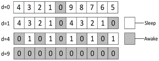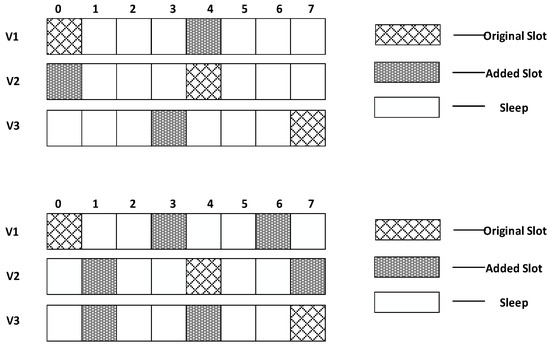 In the model shown in Figure 2, we assume that layer 3 has enough energy to add one slot and layer 4 has enough energy to add two slots. Therefore, as shown in Figure 5 (top), in the third layer, the nodes that wake up at slot 0 add one slot at slot 4; the nodes that wake up at slot 4 add one slot at time 0; the nodes that wake up at slot 7 add one slot at slot 3. In the fourth layer, as shown in Figure 5 (below), the nodes that wake up at slot 0 add two slots at slot 3 and slot 6; the nodes that wake up at slot 4 add two slots at slot 1 and slot 7; the nodes that wake up at slot 7 add two slots at slot 1 and slot 4.