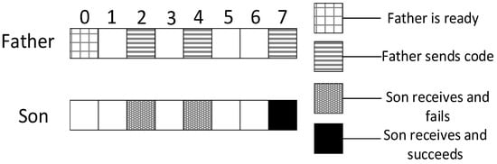 (2) The lifetime of networks usually refers to how long it functions before the first node dies. Obviously, it is required that lifetime should be as long as possible. However, one of the key characteristics of sensor node is that it is usually powered by battery and due to the constraints of manufacturing costs, it should be as small as possible, which also makes it easier for nodes to be deployed [25,26,27]. Under this circumstance, the volume of the batteries is small as well. Also, much research suggests that the WSN is usually deployed in dangerous places [28,29,30,31], or places inaccessible to human beings, which renders it unrealistic to change the dead batteries for new ones; this is another challenging issue to save node energy for longer lifetime [32,33,34,35]. In WSNs, one of the effective ways to save energy is the scheme of duty cycle [7,15]. In this scheme, sensor nodes adopt the method of periodical sleep/awake. Since the node in sleep mode consumes less than one percent of the energy consumed in awake mode, the node should be set in sleep mode as frequently as possible [7,15]. In realistic duty cycle based WSNs, time is divided into several homogenous slots and during one slot, node can complete the receiving and sending of a packet [7,15]. Thus, the duty cycle should be set relatively small for the networks with sparse data. A duty cycle consists of n slots and the duration of one cycle is T, during which there is only one awake slot and the other n − 1 slots are in sleep mode. Although the nodes can save energy by adopting the duty cycle, it causes greater delay. That is because when sender is ready to broadcast the code, it must wait until receiver is awake before beginning to transmit packet.
