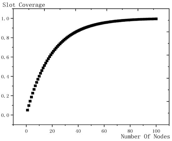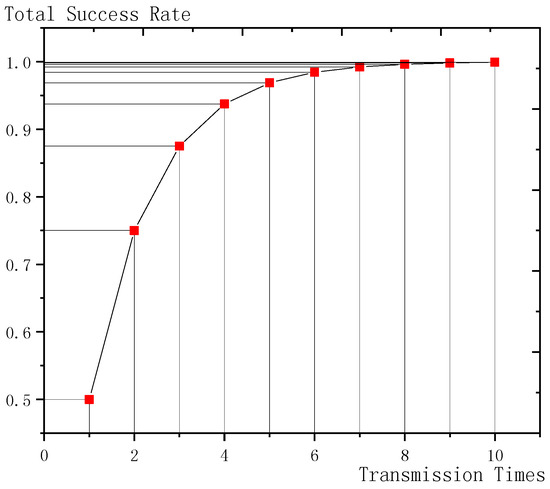 Source nodes are driven by the same battery and have limited energy. The energy of source nodes is set as and the root node has unlimited energy. Each parent has a different number of son nodes. In order to save energy, all nodes have two modes: awake and sleep. During one working cycle, nodes wake up only at one slot and sleep at the others. A working cycle is divided into time slots shared by all nodes, {}. During initialization, each node randomly selects its own awake slot and informs its parent. The awake slots of the brother nodes can be obtained by asking each other. The successful rate of single-time transmission is. To prevent multiple retransmission of the same data packet, the maximum transmission times is set to according to, in which is the minimum transmission times for the total success ratio to reach a threshold.
