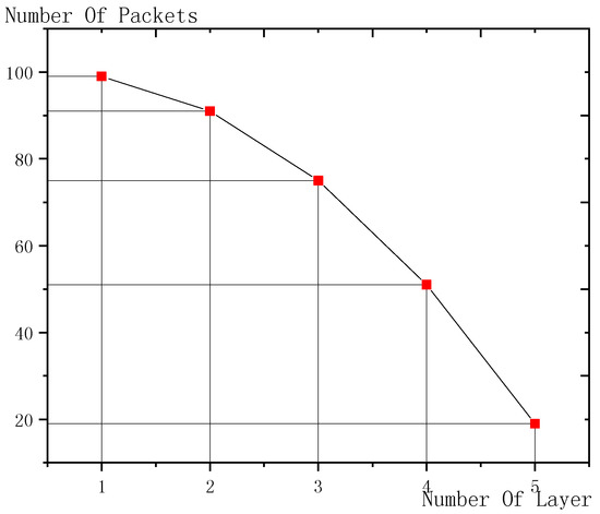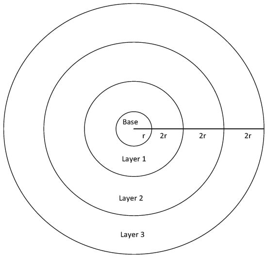 The networks model adopted in this paper is the same as that of Ref. [53]. The nodes are evenly distributed in a circular region with radius, with a root node and identical source nodes . Thus, the entire networks can be represented as , where is the node ID. Sink node is located at the center of the circle. Node density is, according to definition, . Similar networks with that in Ref. [53] can be converted into a tree with sink node as the root of the tree, as shown in Figure 2 in Section 4.1. The main functions of sensor networks are data sensing and the transmission of perceived data through multiple hops routed to sink. The data collected by each node is first sent to its parent node and then passed through the parent nodes step by step, until it reaches.