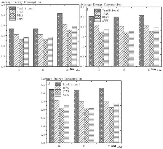 As shown in Figure 24 is the average energy consumption of the four algorithms with as variable. The values of the other parameters are set as described before. The abscissa is the number of slots and the ordinate is the average energy consumption. When the number of slots is increased, the average energy consumption is almost unchanged or slightly increases, which is the same case as the average transmission times. This is because the total energy consumption is mainly composed of the energy consumption of sending code and receiving code. The improvement effect of the three algorithms compared with the traditional algorithm is shown in Table 15. The optimization effect of IFAS is 15.12–25.10%, that of BTAS is 27.16–35.71% and that of AAPS is 22.05–35.04%. As analyzed above, the energy consumption during broadcasting is mainly composed of the energy consumed by the parent node’s sending the packet and the son nodes’ receiving the packet, so it is similar to the average transmission times.
