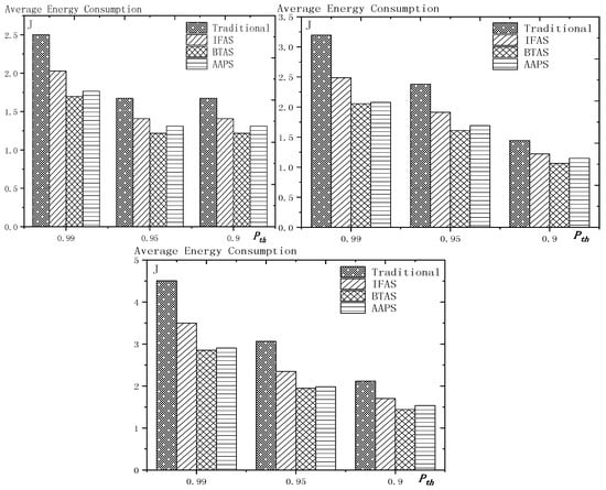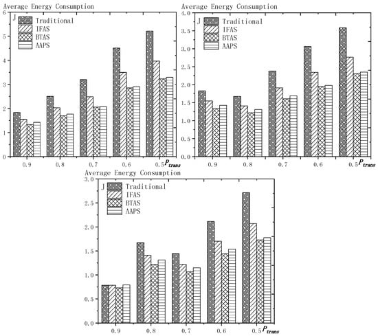 As shown in Figure 26 is the average energy consumption of the four algorithms with as variable. The values of the other parameters are set as described before. The abscissa is the total transmission success rate and the ordinate is the average energy consumption. When the total transmission success rate decreases, the average energy consumption decreases. This is because, as total transmission success rate decreases, the number of transmissions required by a single node decreases and thus the total number of transmission also decreases. The improvement effect of the three algorithms compared with the traditional algorithm is shown in Table 17. The optimization effect of IFAS is 15.45–23.50%, that of BTAS is 26.44–36.73% and that of AAPS is 20.53–35.58%. Since the average energy consumption is mainly affected by the average transmission times, the results are consistent with the average transmission times.