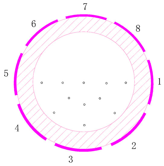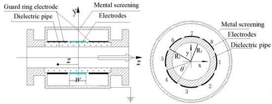 The ESA is illustrated in Figure 1. Eight red copper sheets held tightly against the dielectric quartz glass tube are eight independent electrodes. A metal screening and two guard ring electrodes are used to resist electromagnetic interference. The pipe’s inside radius is denoted by R1, the outside radius by R2, the width of the electrode by W and the electrode angle by θ. Because of electrostatic induction, charges would be induced on each electrode of the ESA when charged particles flow through the testing pipeline.