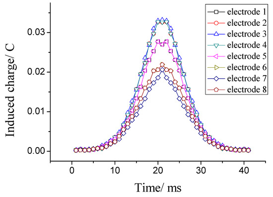 Secondly, the induced charges on the eight electrodes due to multiple charged particles are calculated based on sensitivity modelling. Particles in Ansoft are little balls with a diameter of 0.1 mm. Charges carried by each particle can be set through the parameter settings. Each particle carries a unity charge. Eleven particles move in undisturbed parallel lines (as shown in Figure 4). Other relevant parameters of these particles include the same velocity of 1 m/s, same axial position at any time, and move distance in z direction of −20 mm~20 mm. After the charged particles’ parameters have been set, the induced charges on each electrode can be calculated. Simulation results are shown in Figure 5. It can be seen that there are four types of induced charge curves. The curves for electrodes 6 and 7 are the same. This is because the relative positions of the electrode and eleven charged particles for the two electrodes are the same. Also, it is similar for electrodes 5 and 1. The curves for electrodes 2, 3 and 4 are the same, because the distributions of the charged particles flowing nearby are the same, which would make the most significant contributions to the induced charge.