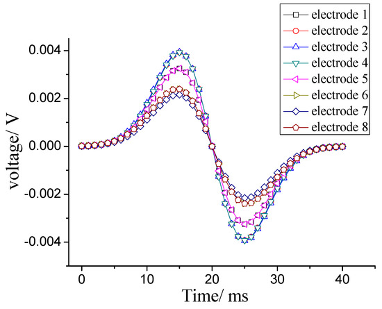 where R is the resistance of the interface circuit. If taking R as a constant, the voltage signal is the same as the derivate of the induced charge curves. Figure 6 shows the eight output signals of the eight electrodes. Accordingly, the output signals also have four types. It is worth noting that the greater the charge amount near the electrode, the larger the amplitude value of the output signal from it.
