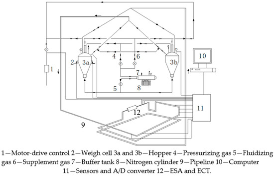 A structure sketch of the pneumatic conveying system of pulverized coal is shown in Figure 8. The experimental setup covers an area of 20 m2. Two hoppers with a capacity of 0.648 m3 and a height of 1.9 m2 adopt the top-discharge and bottom-fluidization arrangement. The pressurizing gas, fluidizing gas and supplement gas are supplied from the buffer tank filled with high-pressure gas. In the feeding hopper, pulverized coal is firstly fluidized by the fluidizing gas, then enters the conveying pipeline, and finally reaches the receiving hopper. The transport steel pipeline has a 10 mm inner diameter and is 45 m long. The ESA and ECT are both installed in position 12 of the conveying pipeline, with a distance of 0.9 m from the bends. The bend radius is 0.06 m. The transported material is pulverized lignite coal, the properties of which are summarized in Table 1.