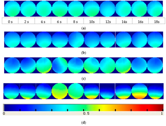 ECT images of four flow patterns (a) fully suspended flow; (b) stratified flow; (c) dune flow; (d) slug flow.