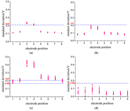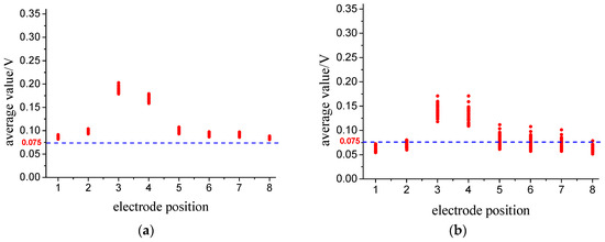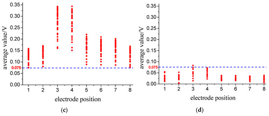 As a consequence of the simulation, only the charged particles flowing near an electrode would make the most significant contributions to its output signal’s amplitude. Thus, the amplitudes of all eight electrodes can give important information on the particles’ distribution in the cross section of the conveying pipe.