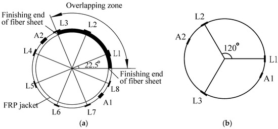 Distribution of strain gauges: (a) carbon Fiber-reinforced polymer (CFRP)-wrapped FLWAC; and, (b) Plain FLWAC.