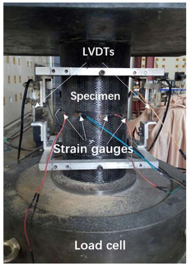 In this experiment, ten 10-mm strain gauges were mounted on the mid-height of each FRP-confined specimen surface, in which two for axial strain measurement and eight for hoop strain measurement. Three of the eight hoop gauges were placed within the overlapping zone. For FLWAC without FRP confinement, three strain gauges were used to measure the hoop strain. Figure 2 demonstrates the distribution of the strain gauges for CFRP-wrapped FLWAC and plain FLWAC, where A denotes the axial strain gauges and L represents the lateral strain gauges (hoop strain gauges). Also, two LVDTs were utilized to obtain the axial displacement of the 185 mm over the middle height for each specimen as shown in Figure 3. All the tests were conducted using a compression machine with a maximum load capacity of 3000 kN. The cylinders were first loaded by force control with a loading rate of 1 kN/s to the initial elastic portion up to 70% of the FLWAC strength, and the loading mode was then converted to displacement control with a rate of 0.3 mm/min until the failure of specimen.