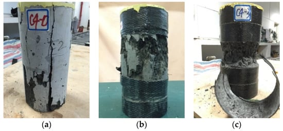 As revealed in Figure 4, these test specimens finally failed with three typical failure modes. Longitudinal cracks (from splitting) were observed for the specimen without CFRP confinement. The major damage to the concrete cylinder was captured along the vertical cracks and it covered the whole section of the FLWAC column from top to bottom. For CFRP-confined FLWAC, as shown in Figure 4b,c, specimens failed due to tensile CFRP rupture due to the expansion of their inner concrete core. Furthermore, the crushed concrete can be seen behind the fiber rupture zone. Notably, with the increase of CFRP plies, the CFRP rupture region was more concentrated, and the concrete was almost crushed into powder for the three-ply CFRP confinement. The observed variations in the failure mode patterns demonstrated that the damage condition of the FLWAC became worse with the increased lateral confinement, which altered the FLWAC crack patterns from vertical macrocracks to localized microcracks. Compared with NC and LWAC, as reported in existing literature, this localization phenomenon is more pronounced for FRP-confined FLWAC. It is attributed to the poriferous characteristics of lightweight fine and coarse aggregates, leading to their increased softening, making them easy to be crushed.