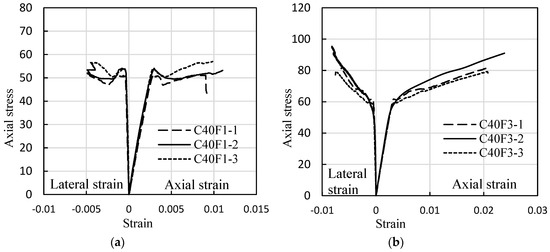 Stress-strain curves of FRP-confined FLWAC. (a) one-ply FRP-confined FLWAC; (b) three-ply FRP-confined FLWAC.