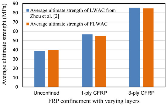Figure 6 compares the unconfined strength of the LWAC and FLWAC columns with their CFRP-confined counterparts with particular attention to varying CFRP ply. The strength of both LWAC and FLWAC columns was observed to be dramatically enhanced by the same rate related to the amount of CFRP confinement (number of layers) and their unconfined strength. These comparisons also show that using fine lightweight aggregates instead of ordinary fine aggregates (river sand) has little effect on their ultimate strength.