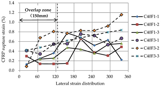 where εf represents the CFRP tensile rupture strain obtained from coupon tests and kɛ is the effective hoop strain factor, which can describe the effective utilization ratio of the CFRP material as it ruptures. Previous reports have indicated that this factor is related to the hoop strain distribution [27,55]. As shown in Figure 7, the distribution of the hoop rupture strain for CFRP-confined FLWAC cylinders at their failure point was non-homogeneous. For all specimens, the maximum lateral strain appeared outside the overlapping zone, which replicates the test results from other types of FRP-confined concrete [2,25,29]. Notably, the rupture strain of concrete wrapping with three-ply CFRP demonstrated a relative higher average value and a more uniform cracking pattern compared with that of concrete wrapping with 1-ply CFRP. According to the observed failure modes shown in Section 3.1, the damage pattern is more concentrated and uniform in specimens with three-ply CFRP confinement, which causes a more even distribution of hoop strains resulting in a larger average rupture strain for specimens with a thicker FRP confinement than that of specimens with a smaller amount of FRP. The calculated effective hoop strain factor is also shown in Table 1. However, existing data for FRP-confined FLWAC is not sufficient to propose a new effective hoop strain factor. In the present paper, after combining this research’s results with test results from Zhou et al. [2] for FRP-confined LWAC, the average value of kε = 0.53 was used for the analysis before the quantitative study of the effective hoop strain factor of the FRP-confined lightweight concrete was available.