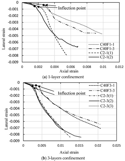 Unconfined concrete starts rapidly volumetric expansion as its axial compression exceeds to 90% of the peak strength, and the fine aggregate effects on the post-peak behavior are not apparent due to the rapid drop in stress. However, this lateral dilatation can be effectively restrained by external FRP confinement, and this increasing expansion of concrete passively generates a continuously increasing lateral confining pressure that is provided by the FRP jacket. The dilation properties of FRP-confined concrete are reflected by its lateral to axial strain relationship. Figure 8 shows the comparison of lateral to axial strain curves for FRP-confined FLWAC in this study and LWAC from Zhou et al. [2], where the concrete strength of all specimens is almost same (39.8 for FLWAC and 38.8 MPa for LWAC). These figures show the lateral-axial strain curves possess a similar pattern, which shows bilinear behavior separating them from the transition zones where concrete expansion accelerates. After the inflation points are formed, the slope of the second part of curves shows significantly different, and an even steeper slope can be found for LWAC specimens or both one- and three-layer FRP confinements. It means that FRP-confined FLWAC shows a larger axial strain than that of FRP-confined LWAC when their lateral strains are same. This could be attributed to the usage of fine lightweight aggregates in FLWAC, resulting in more deformation in the axial direction. In addition, the inflection points for FRP-confined FLWAC is consistently delayed compared to the predicted curve for LWAC, as shown in Figure 8. This is also an evidence that the external FRP was activated later for FRP-confined FLWAC due to “softer” in axial deformation because of containing the fine lightweight aggregate that delays its dilation behavior. Therefore, aggregate type plays a major role on the lateral to axial strain relation for FRP-confined concrete. This test results and conclusion is first proposed and is important for understanding the dilation behavior of FRP confined concrete. Previous study indicated that the dilation behavior of FRP confined concrete is only governed by the concrete grade and lateral confinement pressure [54]. However, according to this study, the dilation behavior of FRP-confined lightweight concrete is also highly related to the fine aggregate properties. Moreover, the different fine aggregates types could further affect the ultimate condition of FRP-confined lightweight concrete, the discussion is given in the following sections.