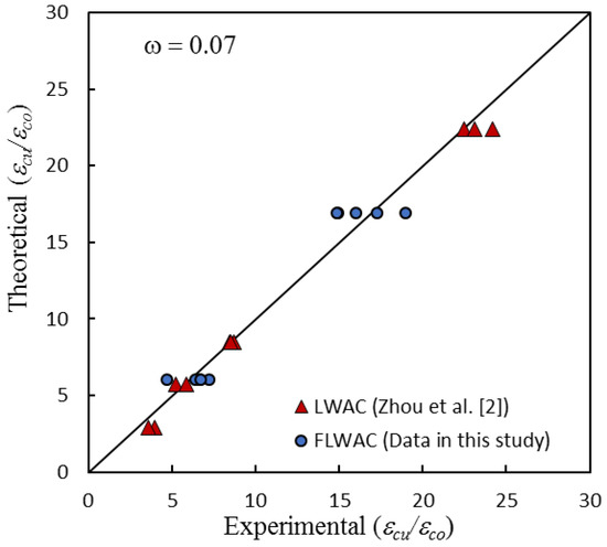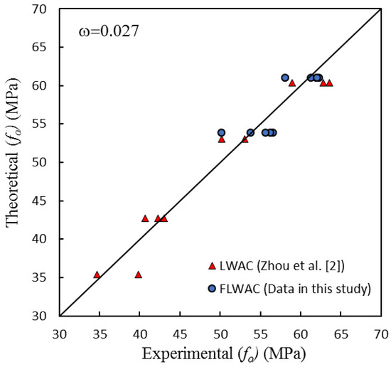As shown in Figure 6 and Figure 9, the enhanced ultimate compressive strengths for FRP-confined FLWAC are almost identical to LWAC; thus, Zhou et al.’s strength model (Equation (4)) is used in this paper for FRP-confined FLWAC. The performance of the proposed ultimate strength model is demonstrated in Figure 10. The error index was evaluated in terms of ω, where Expe. and Theo. represent the experimental and theoretical value, respectively, as given by: