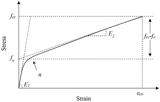 E2 can be directly obtained by the geometric relation of the stress-strain curve. As shown in Figure 13, the E2 is the gradient of the line between points (εcu, fcc) and (0, fo)):