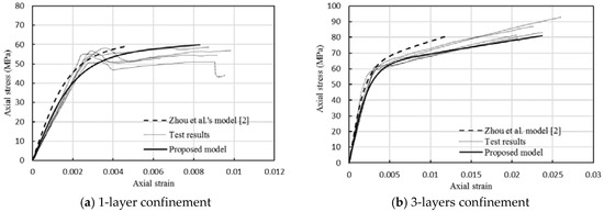 The stress-strain curve of the FRP-confined FLWAC can be generated using Equations (4)–(13). Curves derived using the model proposed for FRP-confined FLWAC and the model of FRP-confined LWAC from [2] are plotted together with test data, as revealed in Figure 15. Thus, Figure 15 indicates the differences in the stress-strain relationship between FRP-confined FLWAC and LWAC. The comparison shows that the stress-strain model developed by Zhou et al. [2] for FRP-confined LWAC does not apply to the FRP-confined FLWAC due to the underestimated ultimate strain. This effect not only applies to the determination of ultimate strain, but also relates to the stiffness of the second curve segment model because the ultimate strain was used to calculate E2. However, the model proposed in this work successfully describes the stress-strain behavior of the FRP-confined FLWAC with good agreement because the effect of fine aggregate on the ultimate strain was carefully considered. The proposed model also can be embedded in the numerical analysis for driving the compressive behavior of elements, and then analyze the global response of FRP-strengthened FLWAC structures.