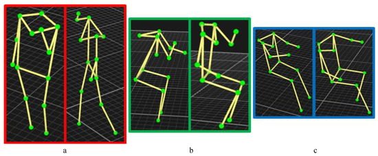 Some of the mentioned variations are shown in Figure 2. The nodes in Figure 2 (green spots) represent the reflective markers that were placed on each subject’s body. (a) shows variations within the making a cell phone call activity; it shows the subject on the left side holding the phone with his/her left hand while standing, while the subject on the right side holds the phone with his/her right hand and walks while making the call. (b) shows variations within the eating activity; it shows the subject on the left side eating using his/her right hand while putting his/her left hand on the table, while the subject on the right side eats with his/her left hand while putting his/her right hand on his/her right leg and having a different posture (back and legs angles) than the subject on the left side. (c) shows variations within the driving activity; it shows the subject on the left side driving with both hands on the wheel while stretching his/her left leg, while the subject on the right side drives using one hand while having the other on the transmission and his/her left leg at a different angle from the subject on the left side.