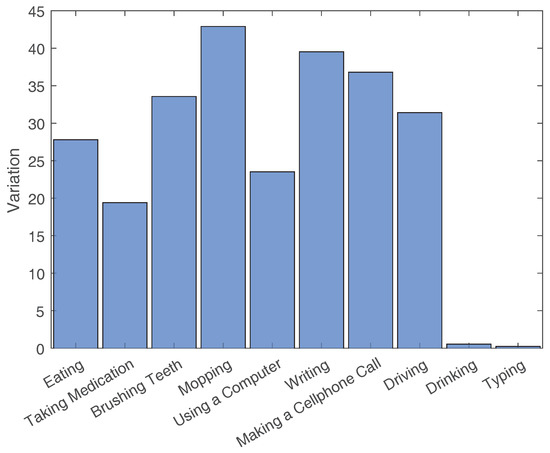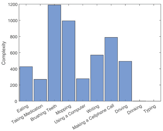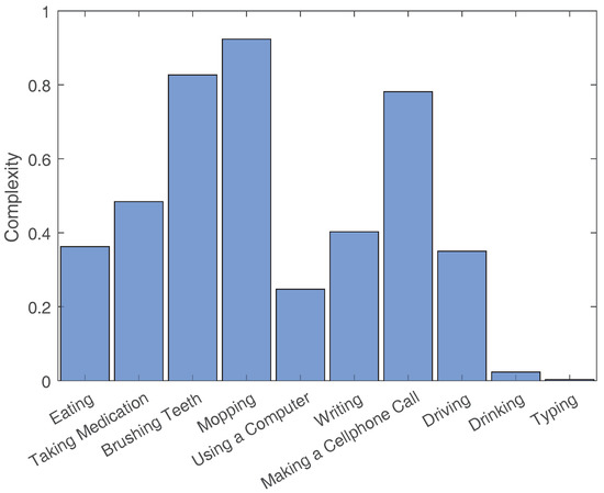 The average values and the values for each activity’s example set are shown in Figure 3, Figure 4, Figure 5 and Figure 6. To contrast other simpler activities, the values for two simple activities are added to the eight activities of this dataset. The first activity is , which consists of drinking water from a cup that is placed on a table. The second activity is , which consists of typing on a keyboard placed on a table while sitting in a chair.