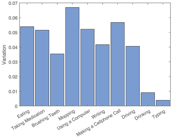 This analysis () concerns testing CAV’s capability of generalizing to new activity variations with which it was not trained. For this purpose, two-thirds of each activity’s examples that had the narrowest range of variation—an average variation value of 22 compared to 32 of the whole dataset (see Figure 5)—were selected. These examples were used as the training dataset, while the rest of the examples served as the inference dataset. The results of this analysis are shown in Table 2.