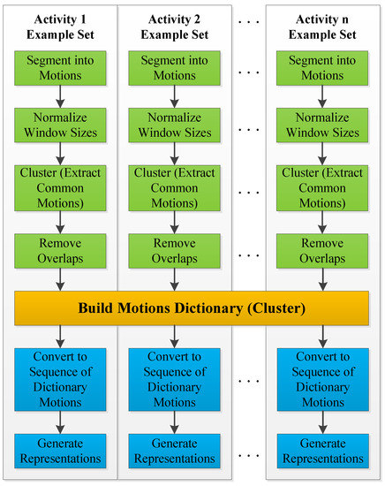 The main steps of the training phase consist of extracting common motions from all examples in the training set in order to build a dictionary of motions, then generating activity representations for each example to be used during inference. These steps are summarized in the flowchart of Figure 7 and are explained in the following.