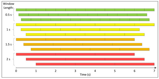 - Segment motions:Each example in the training set is first segmented into windows using four sizes that represent the lengths of 0.5, 1, 1.5 and 2 s. The four window lengths are chosen after studying the lengths of repeated motions and concluding that they usually vary within the chosen range. The segmentation process is repeated three times with segmentation increments of 0%, 25% and 50% of the window size; i.e., the starting points of all windows are shifted by 0%, 25% and 50% of the window size. An example of all resulting windows is shown in Figure 8. Windows longer than 0.5 s are sub-sampled, so that all extracted windows are normalized and have the same size.