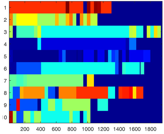 Figure 9. Motion clustering results for brushing teeth. The x-axis designates frame numbers (at 30 Hz). The y-axis designates participants’ IDs. Motions belonging to the same cluster have the same color. The plot shows how different subjects perform the same activity very differently while many motions repeat among multiple subjects [26]. - Build motions dictionary:This step consists of creating a dictionary of motions. First, cluster centers for all activities are clustered using k-means clustering. This second clustering is realized to make sure that motions in the dictionary are distinct since similar motions could exist between two or more activities. The motions dictionary is filled with the new cluster centers that form its vocabulary. Note that, at every step, the algorithm keeps track of where the cluster centers originated. This tracking enables it to get back to every motion in the original examples and label it with the correct dictionary motion ID. The dictionary motion ID is a unique number that identifies each motion in the dictionary.