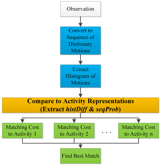 Segmented observations are given to the classifier; each observation consists of only one activity. CAV cannot recognize the presence of a known activity within a stream of data; it cannot automatically detect where the activity starts and where it ends. CAV does not address automatic activity spotting since activity spotting and segmentation algorithms are out of this work’s scope; they are thoroughly studied in other works [29,30,31]. Each observation in the inference dataset is traversed using the four window sizes, as discussed in Section 3.2.1. Each window is then matched, if possible, to a motion that exists in the motion dictionary. When a window matches, the algorithm skips to the adjacent window, without having to go through each window increment. As a result, each observation is converted to a sequence of dictionary motions (motion IDs). Afterward, a histogram of motions is created for each observation while considering the same tf-idf normalization and stop list used in Section 3.2.1.