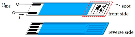 Soot is a highly complex matter. Characteristics like morphology, carbon content, adhered volatile organic components content or water, or its electrical charge will also influence the interaction with a measuring device [7,44,45,46,47,48,49]. For a further knowledge-based development of conductometric soot sensors, the influences of the applied voltage and of the sensor temperature on the soot deposition needs to be investigated. In order to keep flexibility with changing geometries, electrode designs, sensor orientations, housings, or to even be able to manufacture planar capacitive devices [24], we used our own sensor structure as shown in Figure 1. It is fully manufactured in thick-film technology, which is very close to typical production type sensors [27,28]. It is expected that our findings can be transferred to commercial sensors as well.