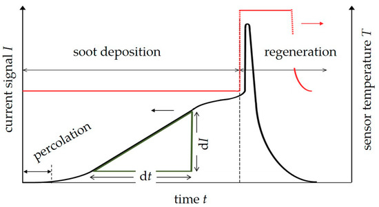 Several modifications, especially for serial applications, have been reported in literature [20,26,27,28,29,31,32]. Not depending on the manufacturer or research lab, most of the conductometric soot sensors are operated similarly. By applying a voltage UIDE to the IDEs, an electrical current I can be measured as soon as the deposited soot particles form a first electrical conductive percolation path between these electrodes. After this blind time, with proceeding soot deposition, the current increases. In other words, the sensor is an integrating device following the dosimeter principle with an instantaneous electrical readout, as described in [37]. During a subsequent regeneration, the sensor is heated to several hundred °C to burn off the soot. When cooled down to ambient temperature, i.e., to exhaust temperature, a new measurement cycle can start, again beginning with a blind time. In addition to a conductometric readout, capacitive measurements have also been investigated [23,24]. A typical operation mode of a conductometric soot sensor is described in Figure 2.