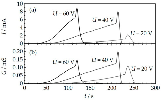 The percolation time (or blind time) also varies with the applied voltage and supports the previous findings. It can be determined directly from the current and/or the conductance curves. For lower applied voltages, the blind time until a first current appears increases. It takes nearly 100 s for 20 V and just 40 s for 60 V until the first current flows. Hence, higher voltages support the formation of conducting paths between the electrodes.