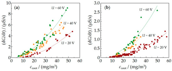 Figure 5 shows the sensor calibration curves, which include the timely derivatives of the conductance dG/dt of a measurement cycle for each point plotted over the soot concentration measured by the Pegasor sensing device (values given in mg/m3). Monotonous correlations between dG/dt and soot concentrations are found for both types of sensor orientation. Furthermore, the provided conductance data are normalized to a common temperature of 300 °C. Higher voltages result in a higher sensor signal. All these findings agree with the literature [35].