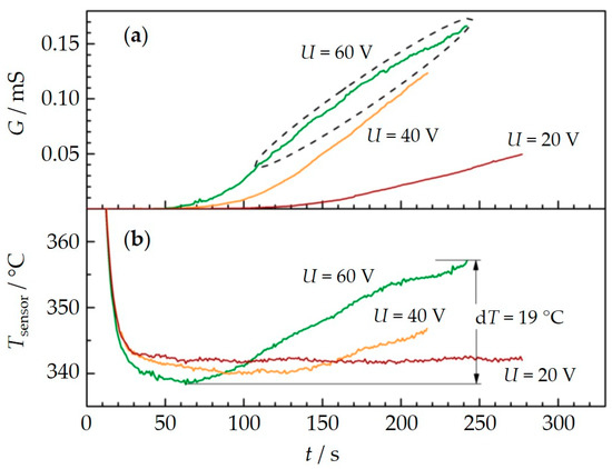 The respective temperature of the sensor element, which was measured by the internal heater structure during the whole experiment, is plotted in Figure 6b. In general, this temperature represents the exhaust temperature. Considering the temperature at 50 s, i.e., after sufficient cooling from regeneration temperature, one finds that the operation conditions are relatively constant and the exhaust temperature varies only in the range of 5 °C. The eye-catching result in this diagram is the increase of the sensor temperature during soot deposition for 60 V of about 19 °C. When 40 V are applied for soot deposition, the sensor temperature increases a little less but still by 9 °C. No temperature increase can be seen for UIDE = 20 V. This suggests that a temperature increase of the sensor is responsible for the decreasing slope of the conductance in Figure 6a.