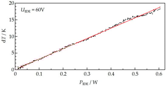 Since a temperature increase of the exhaust gas can be ruled out, an internal heating effect must be responsible for the observed behavior. If one calculates the power PIDE (P = UIDE·I = UIDE2·G) that generates Joule’s heat between the sensing electrodes and plots it vs the observed temperature increase, one obtains Figure 7 (for UIDE = 60 V). In other words, during soot deposition, the power P, which generates heat directly in the deposited soot, increases. At the beginning, the conductance G is zero since no current flows. Since there is no additional power P, there is no temperature increase. The higher the soot loading between the IDE, the higher is the conductance and the more heat is generated. At the end after 250 s, a temperature increase of 19 K occurs. According to Figure 7, applying 60 V between the electrodes leads then to a heat generation of 0.6 W. If we compare that with our experiences concerning the heater structure, materials data and simulations on similar sensor setups [51], an increase of 19 K seems plausible. As a conclusion, the temperature increase with higher applied voltages has a direct and an indirect origin. Due to the higher voltage, the soot deposition rate is higher due to the electrophoretic effect. This causes thicker soot layers that lead to a higher conductance of the soot films. In addition, the generated heat increases quadratically with the voltage.