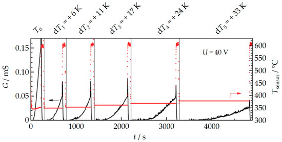 Another experiment was conducted to investigate this “internally caused” thermophoresis effect further. Again, a sensor was constantly operated in the indirect mode with the heater structure facing the gas flow, now with 40 V applied between the electrodes. The engine was operated under constant speed and load. We conducted several soot deposition cycles, one after the other. After each regeneration procedure, the heater was not completely switched off, but set to a certain temperature. As a result, the sensor temperature (Tsensor) during the soot deposition phase could be deliberately increased by small values, dT, compared to the exhaust temperature (Texhaust). The sensor temperature was calculated from the four-wire resistance of the internal platinum structure. In the first cycle, no additional heating was applied (dT = Tsensor − Texhaust = 0 K). In the following cycles, the temperature was increased stepwise to dT = 6, 11, 17, 24, and 33 K. The results are shown in Figure 8.
