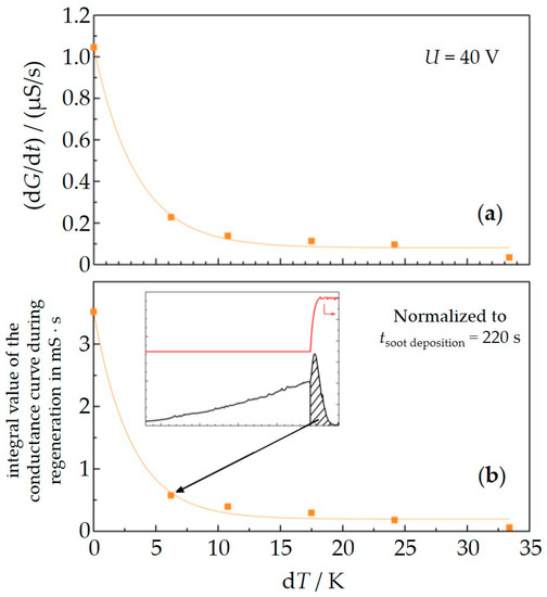 In addition to that, this assumption was verified by another analysis. During regeneration, the current and correspondingly the conductance shows a “peak” behavior. The step change in sensor temperature up to 600 °C leads to an almost sudden conductance increase due to the enhanced soot conductivity, followed by an abrupt decline when the soot gets oxidized and percolation is interrupted. The conductance reaches zero as soon as the soot is burned off. This behavior is well known and often described in literature [12,27,36]. The area below the peak of the conductance curve during regeneration may be correlated to the amount of soot that has been deposited right before the regeneration starts as both effects, the increasing conductance as well as the declining curve, depend on the thickness of the soot layer or its mass, respectively. In case of less deposited soot, the increasing part of the peak during heating up is smaller (less influence of temperature dependent conductivity increase). Furthermore, the declining part of the peak starts faster (less amount will be burned off earlier). Therefore, the peak area is small. Analogously, a higher amount of soot causes a higher current increase, the total oxidation takes longer and as a result, the peak area is larger. So, it should be possible to estimate the final soot loading (i.e., the amount of deposited soot mass) on the sensor surface before regeneration by evaluation of the peak area. We now plot these integral values of the conductance curve during regeneration vs. the temperature difference during soot deposition. Since not only the parameters Tsensor or the applied voltage UIDE determine the amount of soot on the sensor surface, but also the individual time intervals for soot deposition for each single measurement, we have to normalize the integral value results to a similar time span of soot deposition to compare different measurement/regeneration cycles. This is done by the linear relation of conductance over time for each measurement cycle. All values refer now to a soot loading interval of 220 s. Figure 9b shows the correlation of the normalized integral values vs. dT. Here also, the exponential decrease occurs with very similar parameters as found before (exp(−0.3x)). Therefore, the evaluation of the peak area during regeneration can be used as an additional indicator of the amount of deposited soot right before regeneration. This method helps to understand thermophoresis effects when using synthetic soot (e.g., from CAST devices). Here, the conductivity of the soot does not linearly increase with temperature. Therefore, the conductance data are not sufficient to describe the amount of deposited soot [54].
