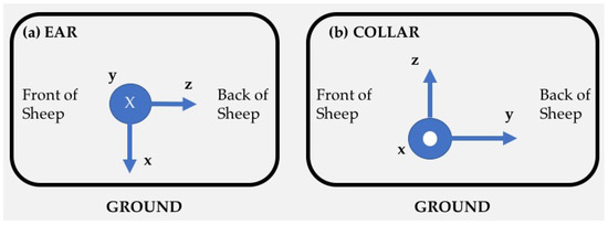 The devices were attached to the six sheep at two locations (a) to the existing electronic identification ear tag via a tape and lightweight plastic tie and (b) to neck collar using tape and lightweight plastic tie. All ear-mounted devices were fixed using the orientation illustrated in Figure 1 (left), whereas all collar-mounted devices were fixed using the orientation shown in Figure 1 (right).