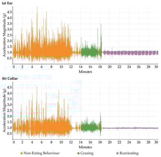 Example graph showing accelerometer data extracted from sensors mounted on one sheep in two locations, ear (a) and collar (b), over 30 min showing grazing, non-eating and ruminating behaviour over time.
