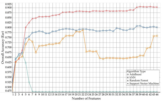 Comparison of overall accuracies for ear, over used number of features (AdaBoost, kNN, random forest and support vector machine).