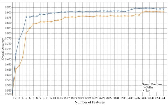 As shown in Figure 5, collar data yielded a higher overall accuracy than the use of ear data across all numbers of features. As more and more features were added, the overall accuracy slowly increased. However, for both collar and ear, the trend of increasing accuracy reached a fist plateau at around 16 features (with a first peak around four to six features) and then only improved again, when more than 36 (ear) and 38 (collar) features were used, after which both performance curves reach a second plateau.
