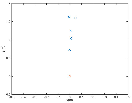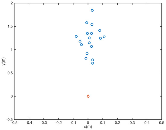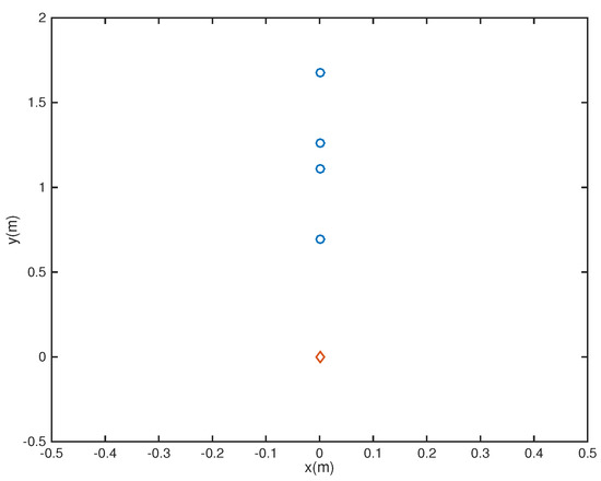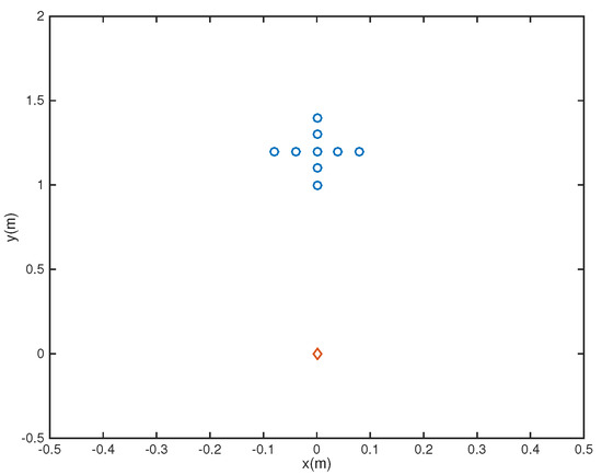 where is the reference central microphone location. In this example, we considered the microphone array pruning problem combined with the design of sparse filters. Assume first that there are nine microphones located at the coordinates {(−0.08, 1.2), (−0.04,1.2), (0,1.2), (0.04,1.2), (0.08,1.2), (0,1.4), (0,1.3), (0,1.1), (0,1)} (Figure 1), with a 26-tap FIR filter behind each element. Note that in the Figures, the speaker is represented by a red diamond while microphones are represented by blue circles. The passband region is defined as
