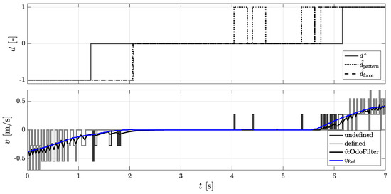 As described in Section 3.5, problems with the estimated slope can occur especially on a hill if the acceleration sensor is not sufficiently calibrated. In order to ensure that both approaches reach their limits for estimating the rolling direction, multiple starts are made on the incline or fast rolling direction changes are induced. In Figure 9 the velocity progression and the rolling directions are shown again.